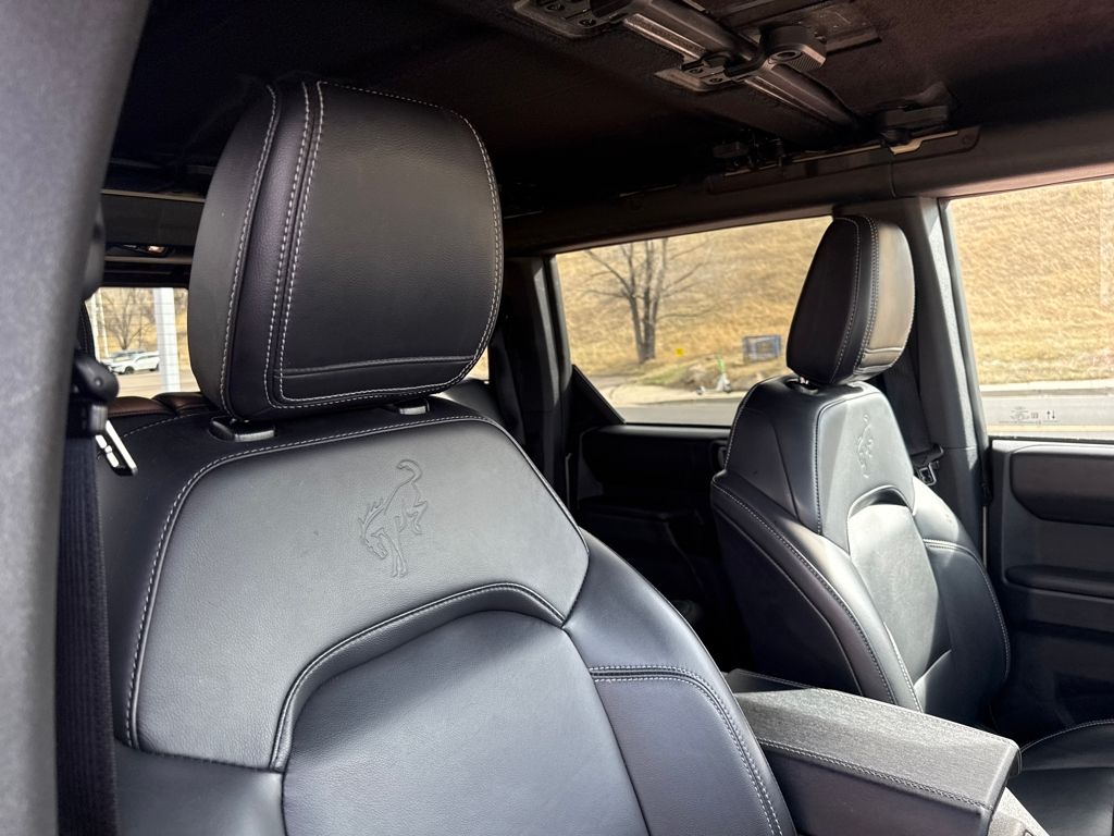 Black Appearance Package (Black Molded-In-Color Door Handles, Black Molded-In-Color Fender Flares, Black Molded-In-Color Sideview Mirror Caps, and Black-Painted Molded-In-Color Grille), Equipment Group 312A Mid Package, 7 Speakers, Dual Tops, Hard Top Sound Deadening Headliner, Heated door mirrors, Navigation system: Connected Navigation, Rear-Window Defroster & Washer, 18" Bright Machined Aluminum Wheels, 3.73 Axle Ratio, 4-Wheel Disc Brakes, ABS brakes, Air Conditioning, Alloy wheels, AM/FM radio: SiriusXM with 360L, AM/FM Stereo, Auto High-beam Headlights, Auto-dimming Rear-View mirror, Automatic temperature control, Brake assist, Compass, Connected Navigation, Delay-off headlights, Driver door bin, Driver vanity mirror, Dual front impact airbags, Dual front side impact airbags, Electronic Stability Control, Emergency communication system: 911 Assist, Exterior Parking Camera Rear, Front anti-roll bar, Front Bucket Seats, Front Center Armrest, Front dual zone A/C, Front fog lights, Front License Plate Bracket, Front reading lights, Front wheel independent suspension, Fully automatic headlights, Heated front seats, Heated Leather-Trimmed/Vinyl Bucket Seats, Heated steering wheel, Illuminated entry, Integrated roll-over protection, Internet access capable: FordPass Connect, Leather Shift Knob, Low tire pressure warning, Occupant sensing airbag, Outside temperature display, Overhead airbag, Overhead console, Panic alarm, Passenger door bin, Passenger vanity mirror, Power door mirrors, Power driver seat, Power passenger seat, Power steering, Power windows, Radio data system, Rear seat center armrest, Remote keyless entry, Security system, Shadow Black-Painted Hard Top, SiriusXM w/360L, Speed control, Split folding rear seat, Steering wheel mounted audio controls, SYNC 4, Tachometer, Telescoping steering wheel, Tilt steering wheel, Traction control, Trip computer, Variably intermittent wipers, and Voltmeter.