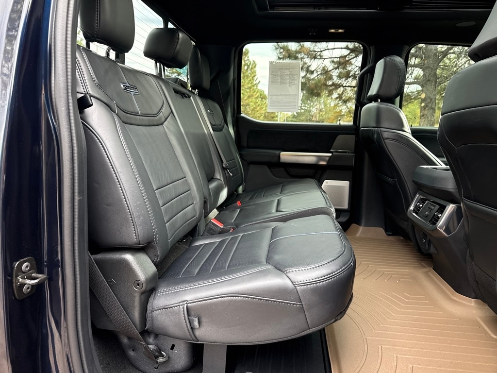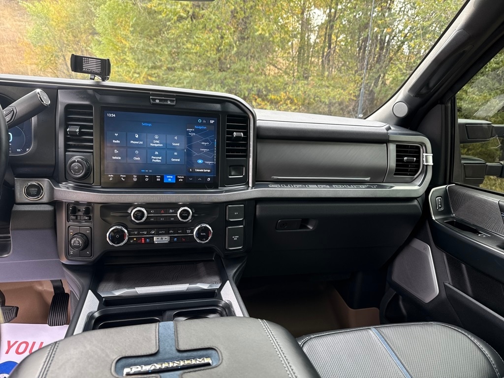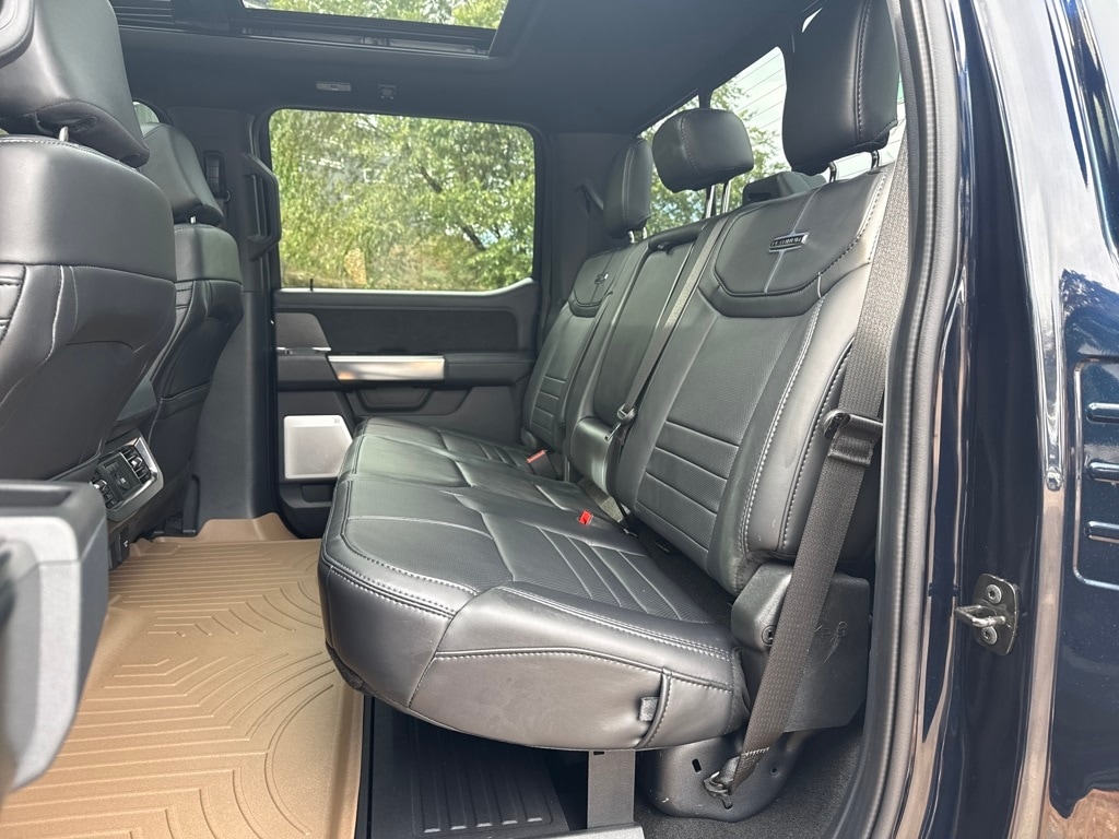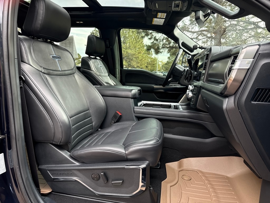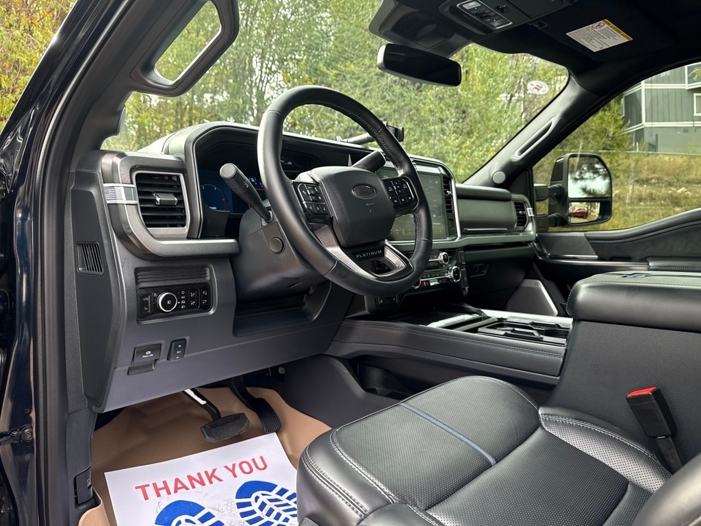 5th Wheel/Gooseneck Hitch Prep Package, High Capacity 11.6" Axle Upgrade Package, Order Code 703A (Flow-Through Console, Radio: B&O Unleashed Sound System by Bang & Olufsen, and Unique Platinum Leather 40/Console/40 Seats), 4WD, 14 Speakers, 4-Wheel Disc Brakes, 410 Amp Dual Alternators, ABS brakes, Adjustable pedals, Air Conditioning, Alloy wheels, AM/FM radio: SiriusXM with 360L, Auto High-beam Headlights, Auto tilt-away steering wheel, Auto-dimming Rear-View mirror, Automatic temperature control, Brake assist, Bumpers: body-color, Compass, Delay-off headlights, Driver door bin, Driver vanity mirror, Dual front impact airbags, Dual front side impact airbags, Electronic Stability Control, Emergency communication system: SYNC 4 911 Assist, Engine Block Heater, Front anti-roll bar, Front Bucket Seats, Front Center Armrest, Front dual zone A/C, Front fog lights, Front License Plate Bracket, Front reading lights, Fully automatic headlights, Garage door transmitter, Heads-Up Display, Heated door mirrors, Heated front seats, Heated rear seats, Heated steering wheel, Illuminated entry, Leather steering wheel, Low tire pressure warning, Memory seat, Navigation System, Outside temperature display, Overhead airbag, Overhead console, Panic alarm, Passenger door bin, Passenger vanity mirror, Pedal memory, Power door mirrors, Power driver seat, Power passenger seat, Power steering, Power windows, Pro Power Onboard - 2kW, Rain sensing wipers, Rapid-Heat Supplemental Cab Heater, Rear reading lights, Rear seat center armrest, Rear step bumper, Rear window defroster, Remote keyless entry, Security system, Speed control, Split folding rear seat, Steering wheel memory, Steering wheel mounted A/C controls, Steering wheel mounted audio controls, Tachometer, Telescoping steering wheel, Tilt steering wheel, Traction control, Trip computer, Turn signal indicator mirrors, Twin Panel Power Moonroof, Upfitter Switches (6), Variably intermittent wipers, and Ventilated front seats.