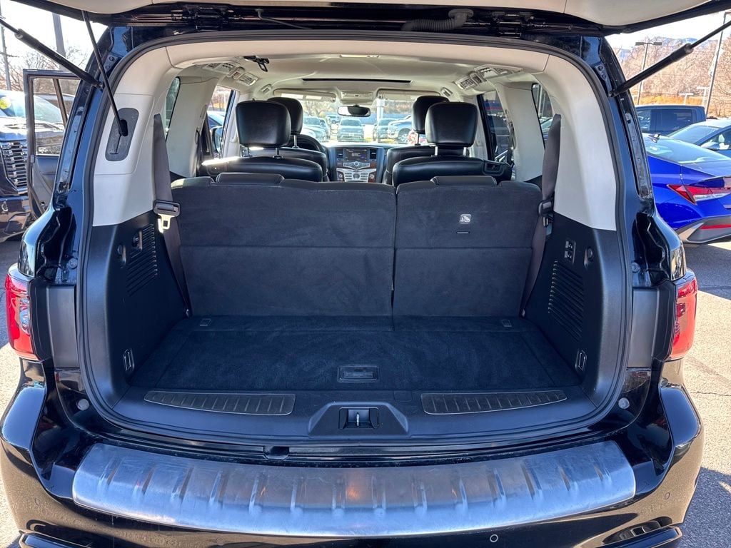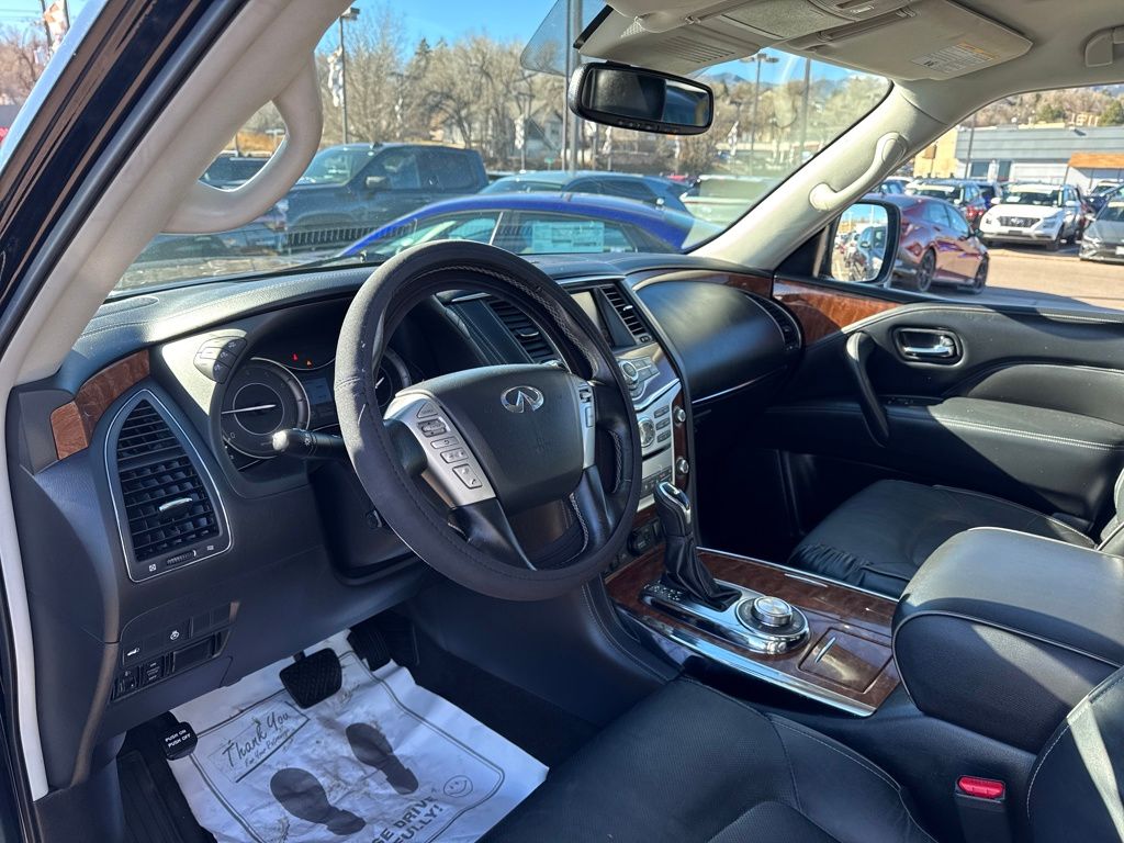 13 Speakers, 2.94 Axle Ratio, 3rd row seats: split-bench, 4-Wheel Disc Brakes, ABS brakes, Air Conditioning, Alloy wheels, AM/FM radio: SiriusXM, Anti-whiplash front head restraints, Auto High-beam Headlights, Auto tilt-away steering wheel, Auto-dimming door mirrors, Auto-dimming Rear-View mirror, Auto-leveling suspension, Automatic temperature control, Brake assist, Bumpers: body-color, CD player, Delay-off headlights, Driver door bin, Driver vanity mirror, Dual front impact airbags, Dual front side impact airbags, DVD-Audio, Electronic Stability Control, Emergency communication system: INFINITI Connection, Four wheel independent suspension, Front anti-roll bar, Front Bucket Seats, Front Center Armrest, Front dual zone A/C, Front fog lights, Front reading lights, Fully automatic headlights, Garage door transmitter: HomeLink, Genuine wood console insert, Genuine wood dashboard insert, Genuine wood door panel insert, Heated door mirrors, Heated Front Bucket Seats, Heated front seats, Heated steering wheel, Illuminated entry, Leather Shift Knob, Leather steering wheel, Leather-Appointed Seats w/Stratford Burl Trim, Literature Kit, Low tire pressure warning, Memory seat, Navigation system: INFINITI InTouch Navigation, Occupant sensing airbag, Outside temperature display, Overhead airbag, Overhead console, Panic alarm, Passenger door bin, Passenger vanity mirror, Power door mirrors, Power driver seat, Power Liftgate, Power moonroof, Power passenger seat, Power steering, Power windows, Radio data system, Radio: AM/FM/HD w/Single In-Dash CD/DVD Player & MP3, Rain sensing wipers, Rear air conditioning, Rear anti-roll bar, Rear audio controls, Rear reading lights, Rear seat center armrest, Rear window defroster, Rear window wiper, Reclining 3rd row seat, Remote keyless entry, Roof rack: rails only, Security system, Speed control, Speed-sensing steering, Split folding rear seat, Spoiler, Steering wheel memory, Steering wheel mounted audio controls, Tachometer, Telescoping steering wheel, Tilt steering wheel, Traction control, Trip computer, Turn signal indicator mirrors, Variably intermittent wipers, Voltmeter, Wheels: 20" x 8.0" Aluminum-Alloy, and Wheels: 22" x 8.0" 14-Spoke Forged Aluminum-Alloy.