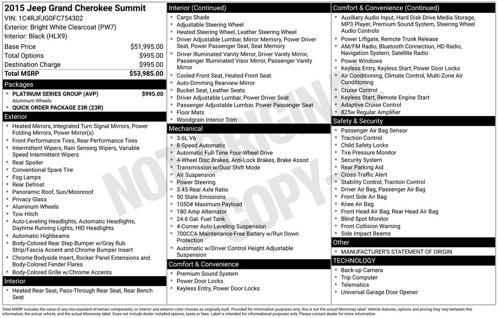 Platinum Series Group (Regional) (Body Color Door Handles, Body Color Exterior Mirrors, Body Color Sills w/Platinum, Body Color/Platinum Front Fascia, Body Color/Platinum Rear Fascia, Gloss Black Grille-Platinum Chrome, Platinum Badge, Platinum Strip Tail Lamp, and Wheels: 20" x 8.0" Satin Carbon), Quick Order Package 23R, 4WD, 19 Speakers, 20" x 8.0" Polished Aluminum Wheels, 3.45 Rear Axle Ratio, 4-Wheel Disc Brakes, 8.4" Touchscreen Display, ABS brakes, Air Conditioning, Alloy wheels, AM/FM radio: SiriusXM, Anti-whiplash front head restraints, Audio memory, Auto High-beam Headlights, Auto-dimming door mirrors, Auto-dimming Rear-View mirror, Auto-leveling suspension, Automatic temperature control, Brake assist, Bumpers: body-color, Compass, Delay-off headlights, Driver door bin, Driver vanity mirror, Dual front impact airbags, Dual front side impact airbags, Electronic Stability Control, Emergency communication system: Uconnect guardian, Exterior Parking Camera Rear, Four wheel independent suspension, Front anti-roll bar, Front Bucket Seats, Front Center Armrest w/Storage, Front dual zone A/C, Front fog lights, Front reading lights, Fully automatic headlights, Garage door transmitter, Genuine wood dashboard insert, GPS Antenna Input, Headlight cleaning, Heated door mirrors, Heated front seats, Heated rear seats, Heated steering wheel, High intensity discharge headlights: Bi-Xenon, Illuminated entry, Knee airbag, Leather Shift Knob, Leather steering wheel, Leather Trimmed Bucket Seats, Low tire pressure warning, Manufacturer's Statement of Origin, Memory seat, Navigation System, Normal Duty Suspension, Occupant sensing airbag, Outside temperature display, Overhead airbag, Overhead console, Panic alarm, Passenger door bin, Passenger vanity mirror, Power door mirrors, Power driver seat, Power Liftgate, Power moonroof, Power passenger seat, Power steering, Power windows, Radio data system, Radio: Uconnect 8.4 NAV, Rain sensing wipers, Rear anti-roll bar, Rear reading lights, Rear seat center armrest, Rear window defroster, Rear window wiper, Remote keyless entry, Roof rack: rails only, Security system, Speed control, Speed-Sensitive Wipers, Split folding rear seat, Spoiler, Steering wheel mounted audio controls, Tachometer, Telescoping steering wheel, Tilt steering wheel, Traction control, Trip computer, Turn signal indicator mirrors, Variably intermittent wipers, and Ventilated front seats.