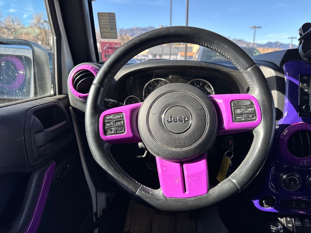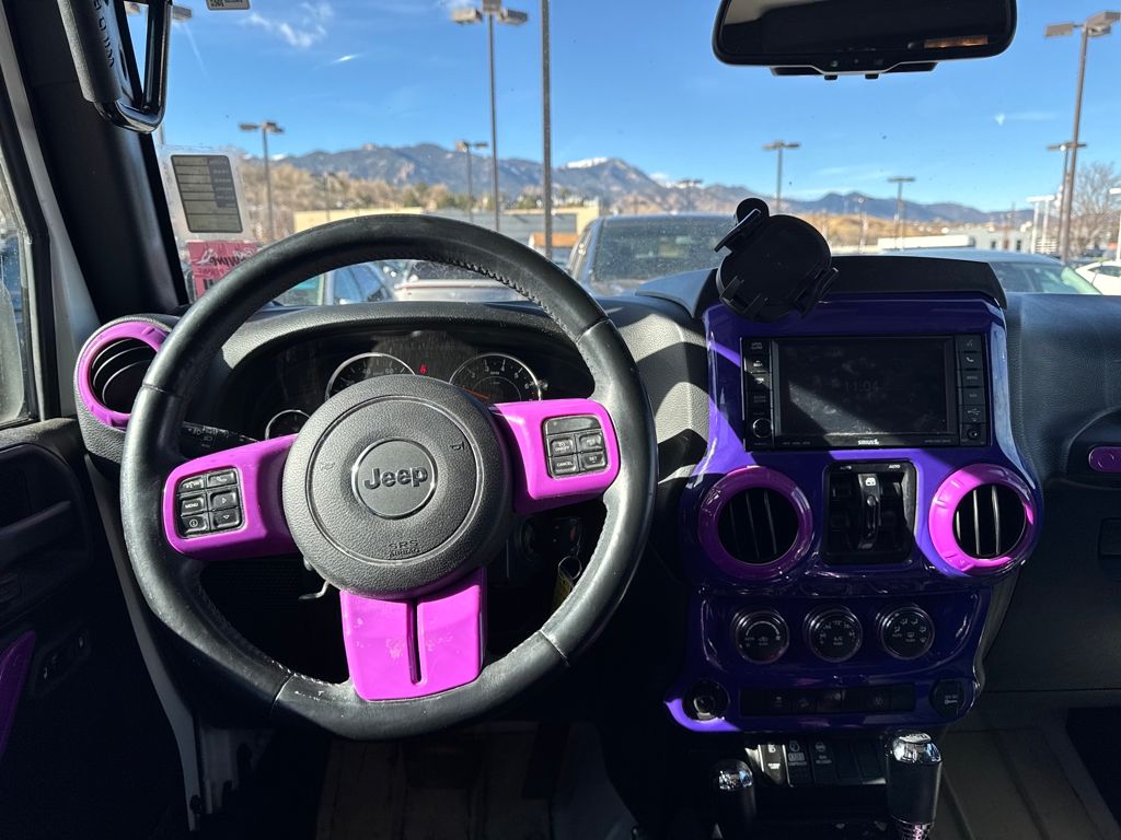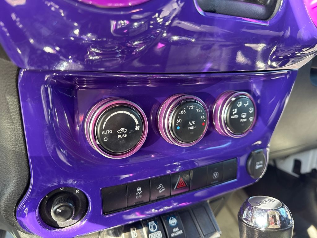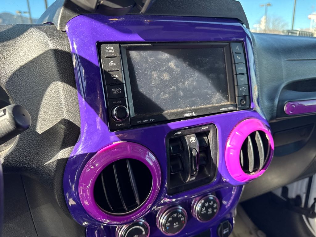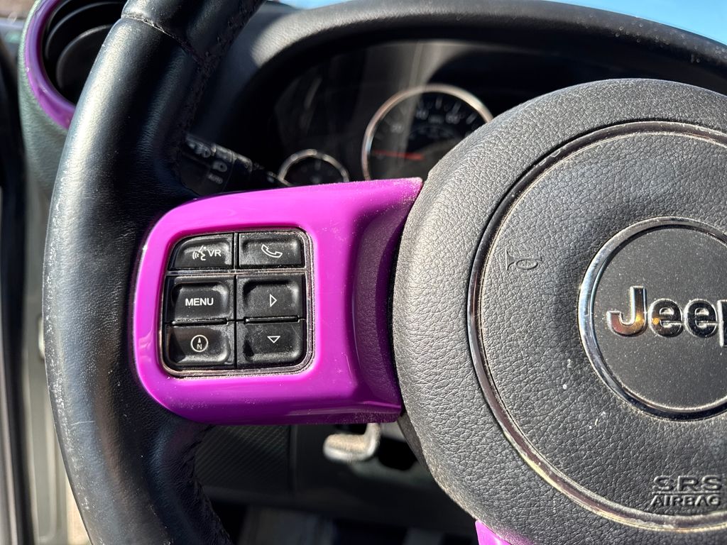 Connectivity Group (Tire Pressure Monitoring Display and Vehicle Information Center), Quick Order Package 24G, 18" x 7.5" Polished Satin Carbon Wheels, 3.21 Rear Axle Ratio, 4-Wheel Disc Brakes, 40GB Hard Drive w/20GB Available, 5-Year SIRIUSXM Traffic Service, 5-Year SIRIUSXM Travel Link Service, 8 Speakers, ABS brakes, Air Conditioning, Air Conditioning w/Auto Temperature Control, Air Filtering, Alloy wheels, AM/FM radio, Audio Jack Input for Mobile Devices, Auto-dimming Rear-View mirror, Black 3-Piece Hard Top, Brake assist, CD player, Cloth Bucket Seats, Compass, Delete Sunrider Soft Top, Driver door bin, Driver vanity mirror, Dual front impact airbags, Electronic Stability Control, Freedom Panel Storage Bag, Front anti-roll bar, Front Bucket Seats, Front Center Armrest w/Storage, Front fog lights, Front reading lights, Fully automatic headlights, Heated door mirrors, Heavy Duty Suspension w/Gas Shocks, Humidity Sensor, Illuminated entry, Integrated roll-over protection, Integrated Voice Command w/Bluetooth, Leather steering wheel, Leather Wrapped Steering Wheel, Low tire pressure warning, Occupant sensing airbag, Outside temperature display, Panic alarm, Passenger door bin, Passenger vanity mirror, Power door mirrors, Power steering, Power windows, Radio data system, Radio: Uconnect 130 AM/FM/CD/MP3, Radio: Uconnect 730N CD/DVD/MP3/HDD/NAV, Rear anti-roll bar, Rear Window Defroster, Rear Window Wiper/Washer, Remote keyless entry, Remote USB Port, Security system, SIRIUSXM Traffic, SIRIUSXM Travel Link, Speed control, Split folding rear seat, Steering wheel mounted audio controls, Sunrider Soft Top, Tachometer, Tilt steering wheel, Traction control, Trip computer, Uconnect Voice Command w/Bluetooth, and Variably intermittent wipers.