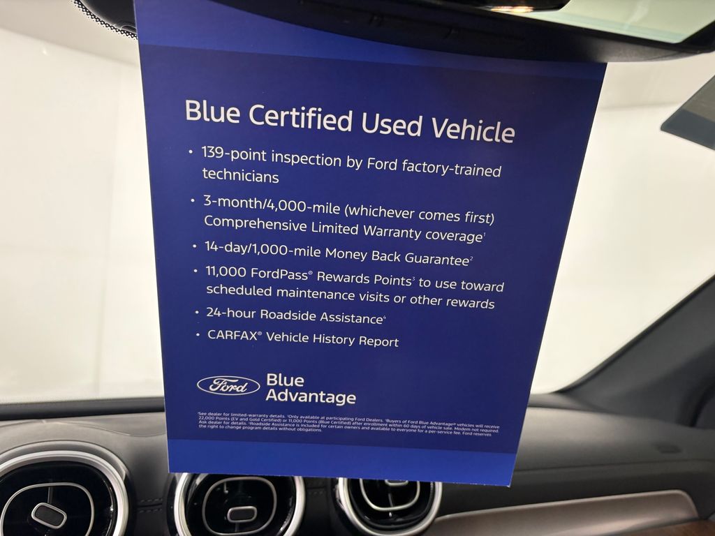 139 point vehicle inspection performed by an ASE Certified technician 3-month/4,000-mile Comprehensive Limited Warranty coverage that is fully competitive with other online retailers Blue Certification includes 11,000 FordPass Rewards Points For other manufacturers not listed above, Comprehensive Coverage is provided for 3 months or 4,000 miles, whichever comes first, from the signature date of the Ford Blue Advantage â" Blue Certified purchase. Comprehensive Limited Warranty covering 1,000+ components Travel expense reimbursement Rental car reimbursement SiriusXM 3 month tria. Recent Arrival! Odometer is 7648 miles below market average! 24/32 City/Highway MPG
